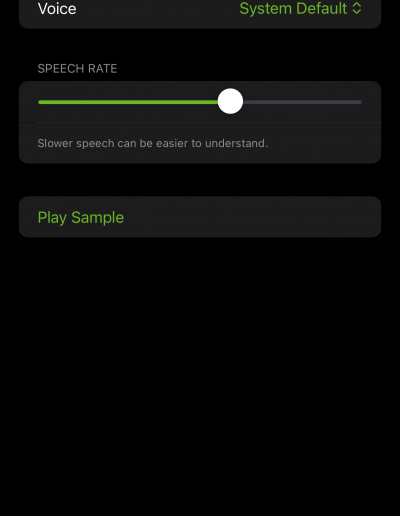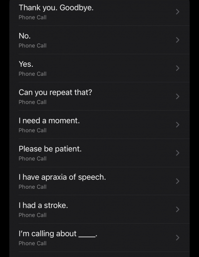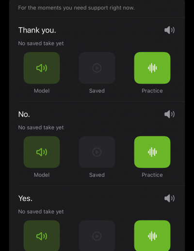 A simplified playback-focused view for real-world situations. Tap to speak, replay saved recordings, or hand the phone to someone else when talking feels overwhelming.