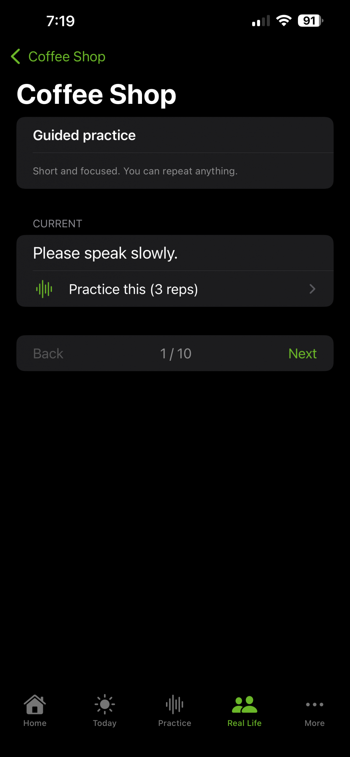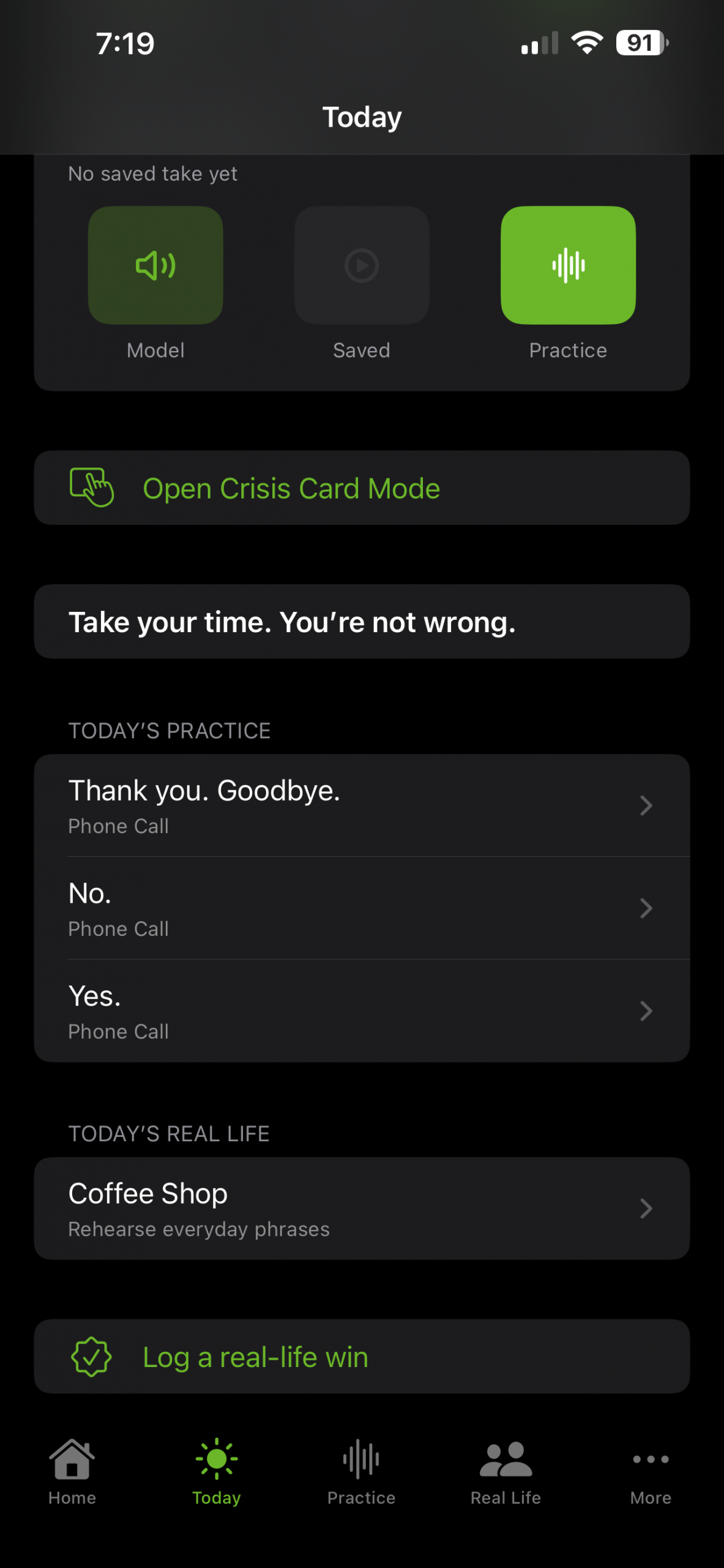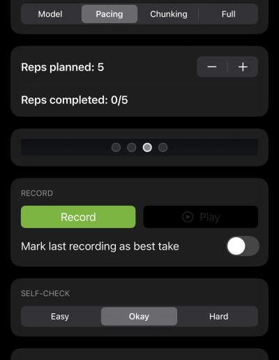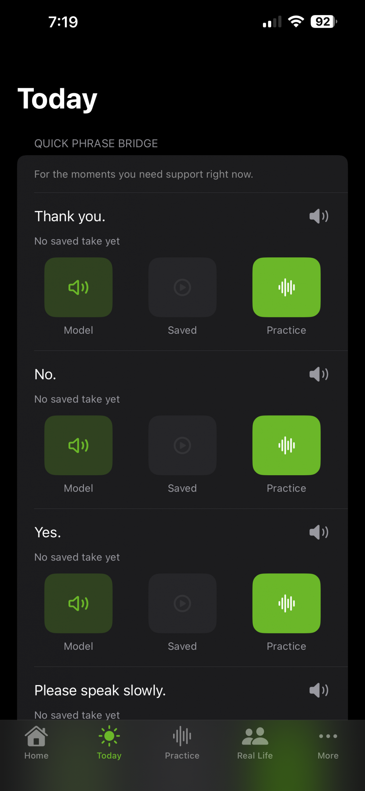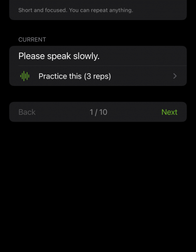 A supportive, self-paced space to practice phrases without pressure. Includes adjustable Cue Support (Low / Medium / High) with pacing dots, phrase chunking, model voice playback, and gentle coaching tips.