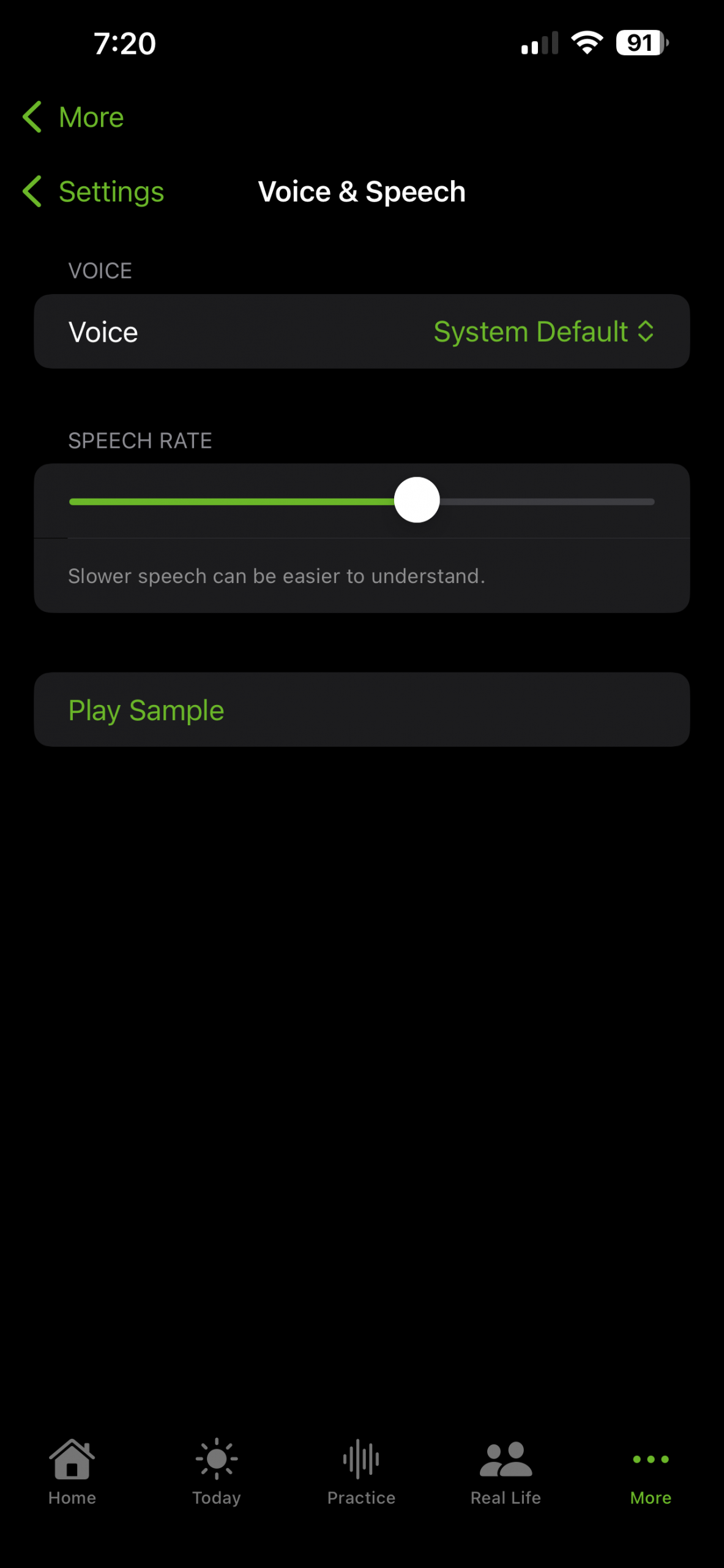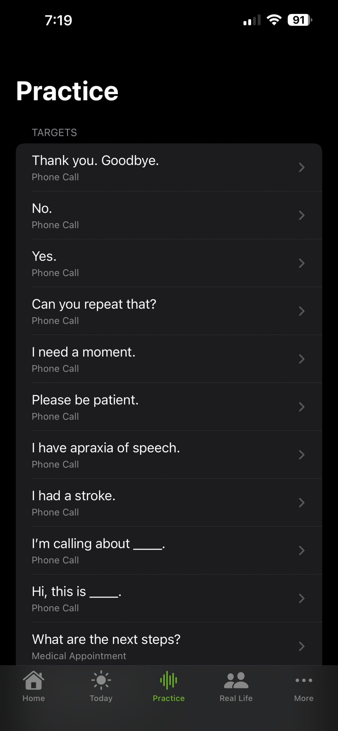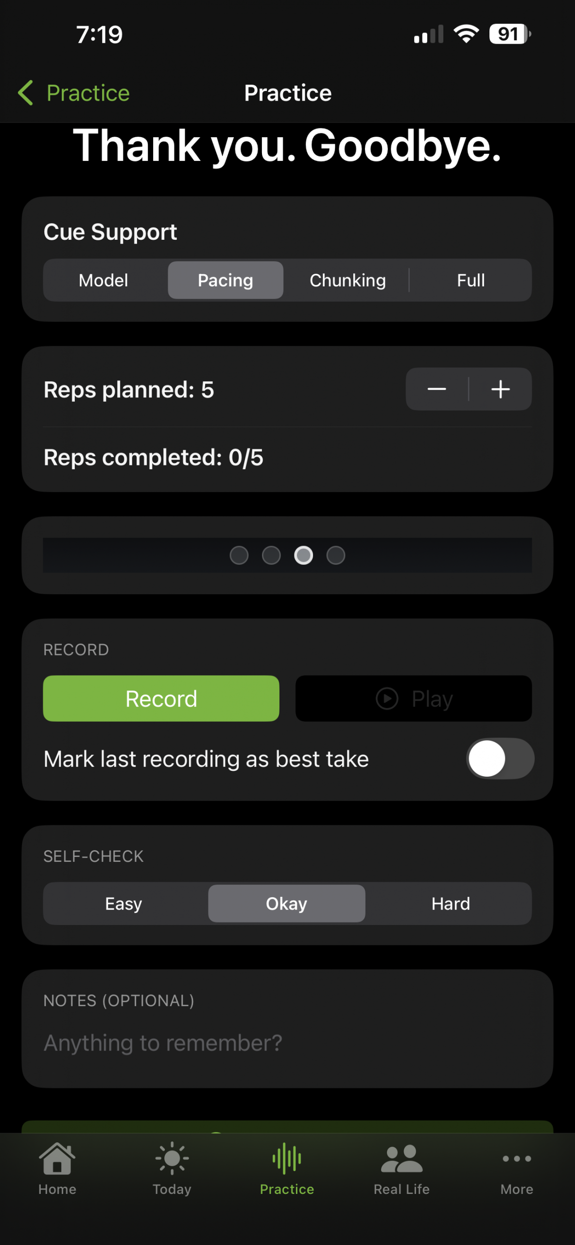 A supportive, self-paced space to practice phrases without pressure. Includes adjustable Cue Support (Low / Medium / High) with pacing dots, phrase chunking, model voice playback, and gentle coaching tips.