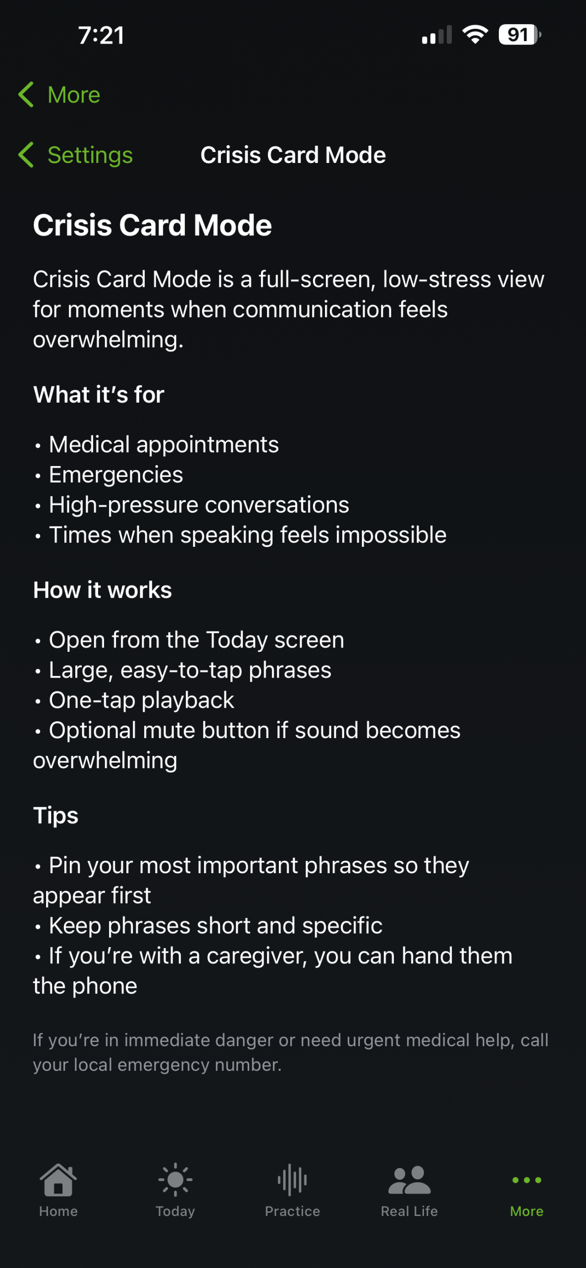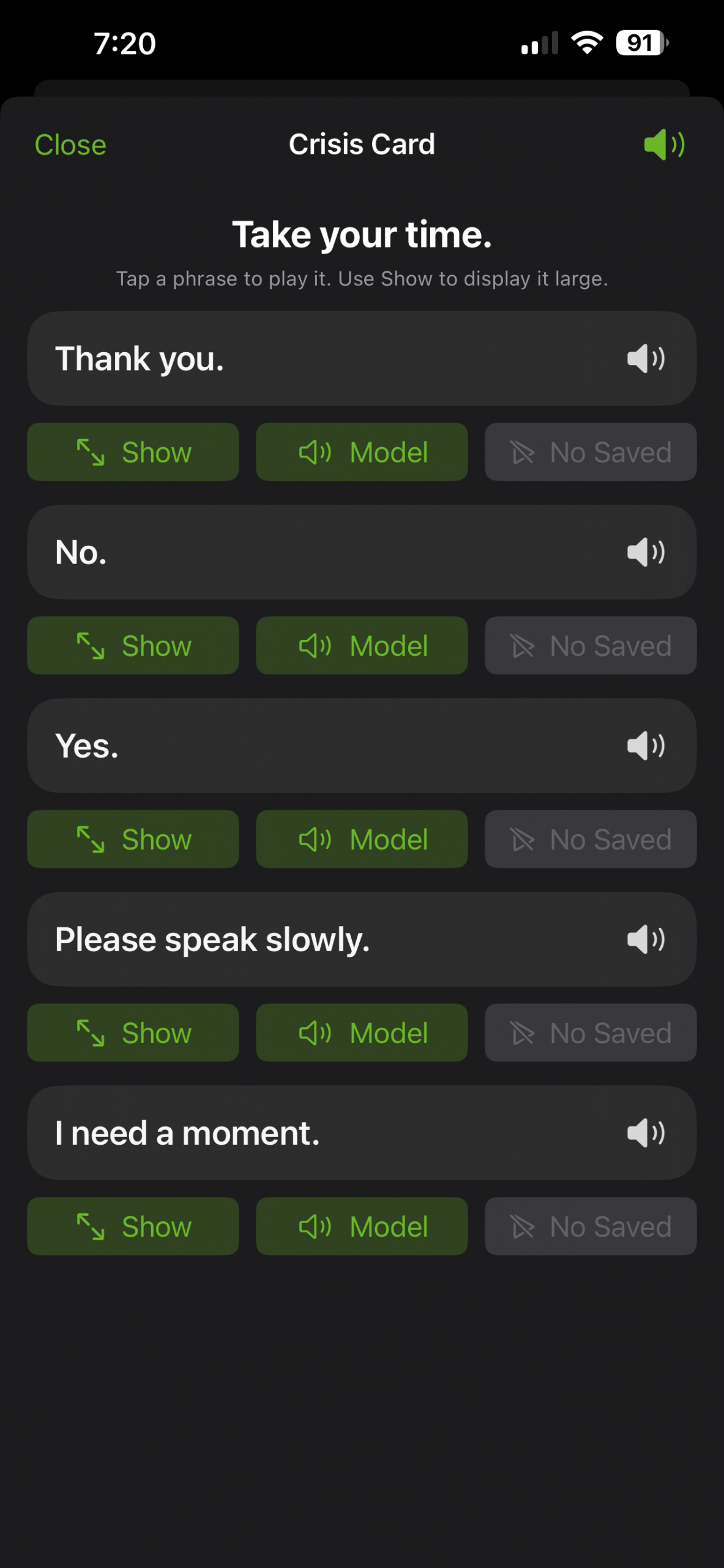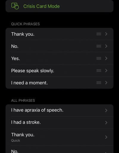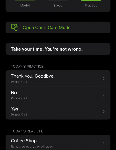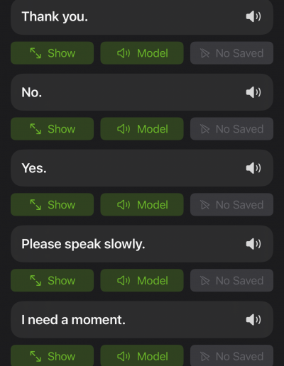 A full-screen, low-stimulation mode for high-pressure moments like medical appointments or emergencies. Large text, one-tap playback, optional mute, and “Show” mode for visual communication.