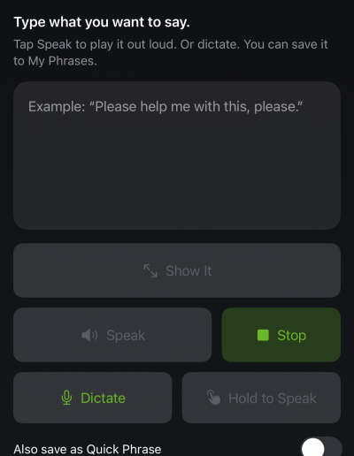 An immediate fall back for when the user needs to communicate. The feature enables text to voice and text to large display text so that users can easily communicate with others.