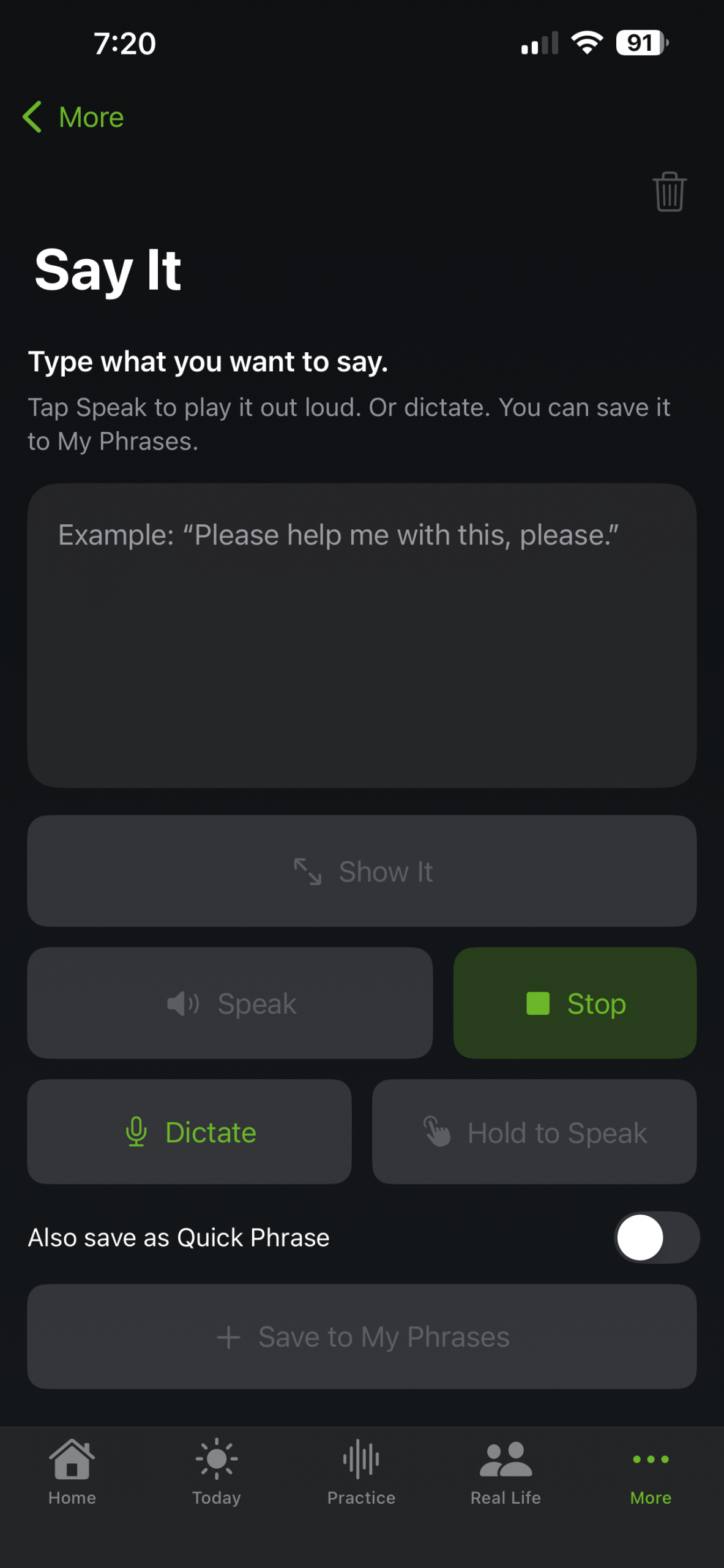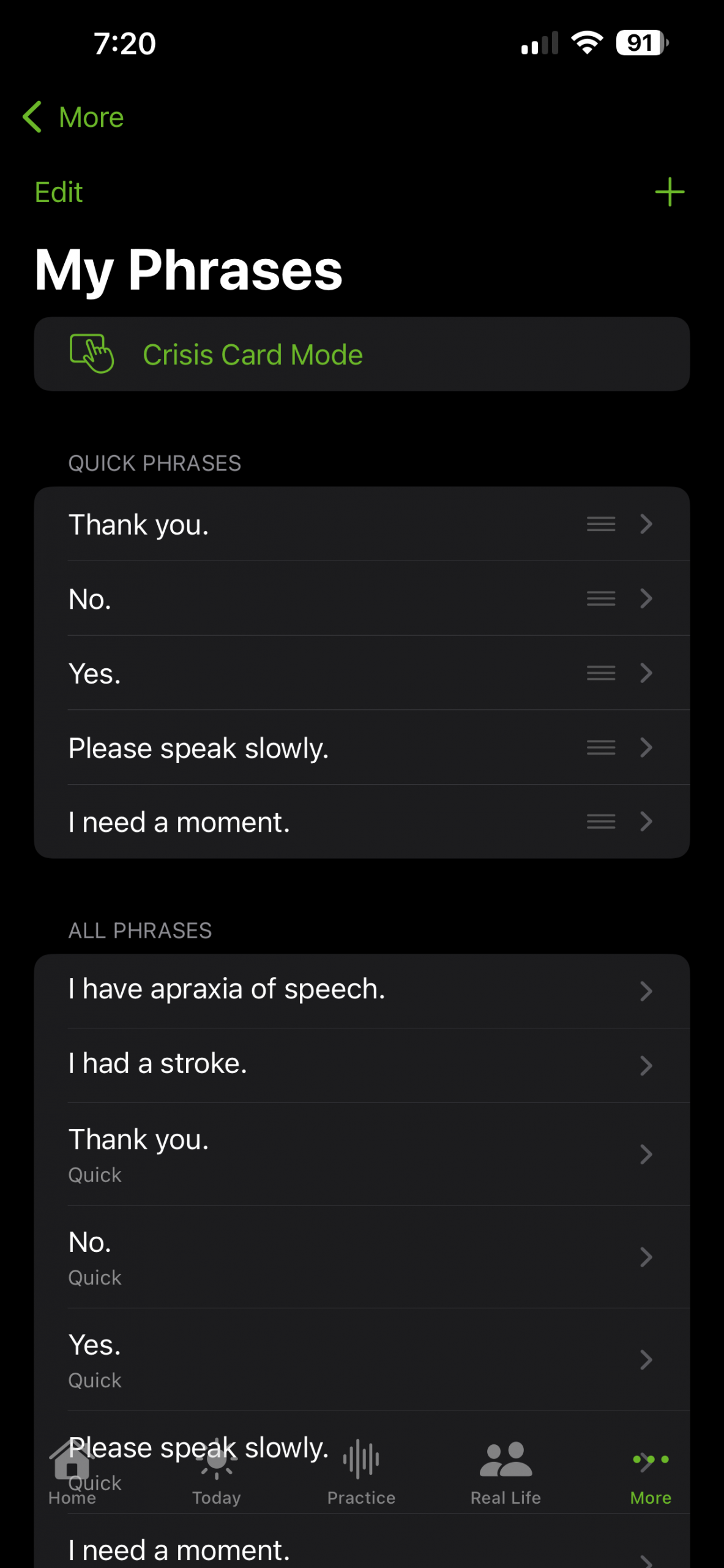 A fast-access screen for phrases you need right now. Pin your most important phrases so they always appear first. One tap plays the phrase instantly.