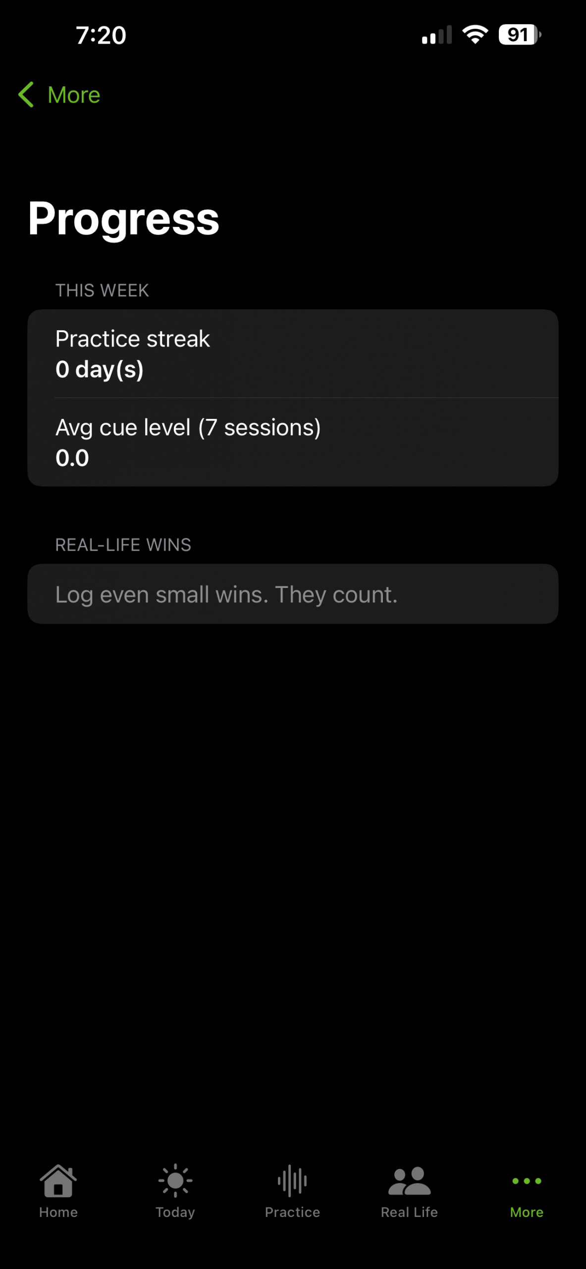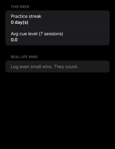 A lightweight progress view that tracks practice streaks and cue usage — without judgment. Progress is about confidence gained, not scores.