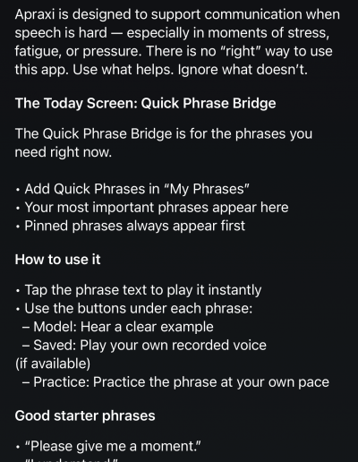 Most communication tools assume speech is always available — or that practice should feel like training. Apraxi is built on a different idea: communication comes first — clarity over correctness, calm over speed. By separating practice from real-life use, and by letting support scale up or down as needed, Apraxi respects how speech actually works in the body — especially under stress.